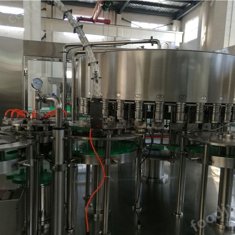 果蔬汁饮料灌装生产线是集冲洗、灌装旋盖为一体的全自动多功能联合机组,生产线加吹干、套标或贴标、膜包组成完整生产线,它广泛应用于各种无气液料的灌装,此线产量为2000-15000瓶/时。